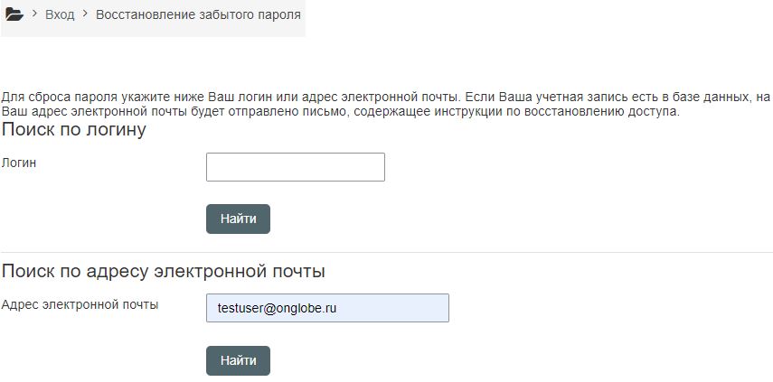 Далее откроется страница восстановления пароля, на которой необходимо ввести свой логин (в верхнее поле) или адрес своей электронной почты (нижнее поле), используемый в Вашей учетной записи на сайте, и нажать соответствующую кнопку "Найти".